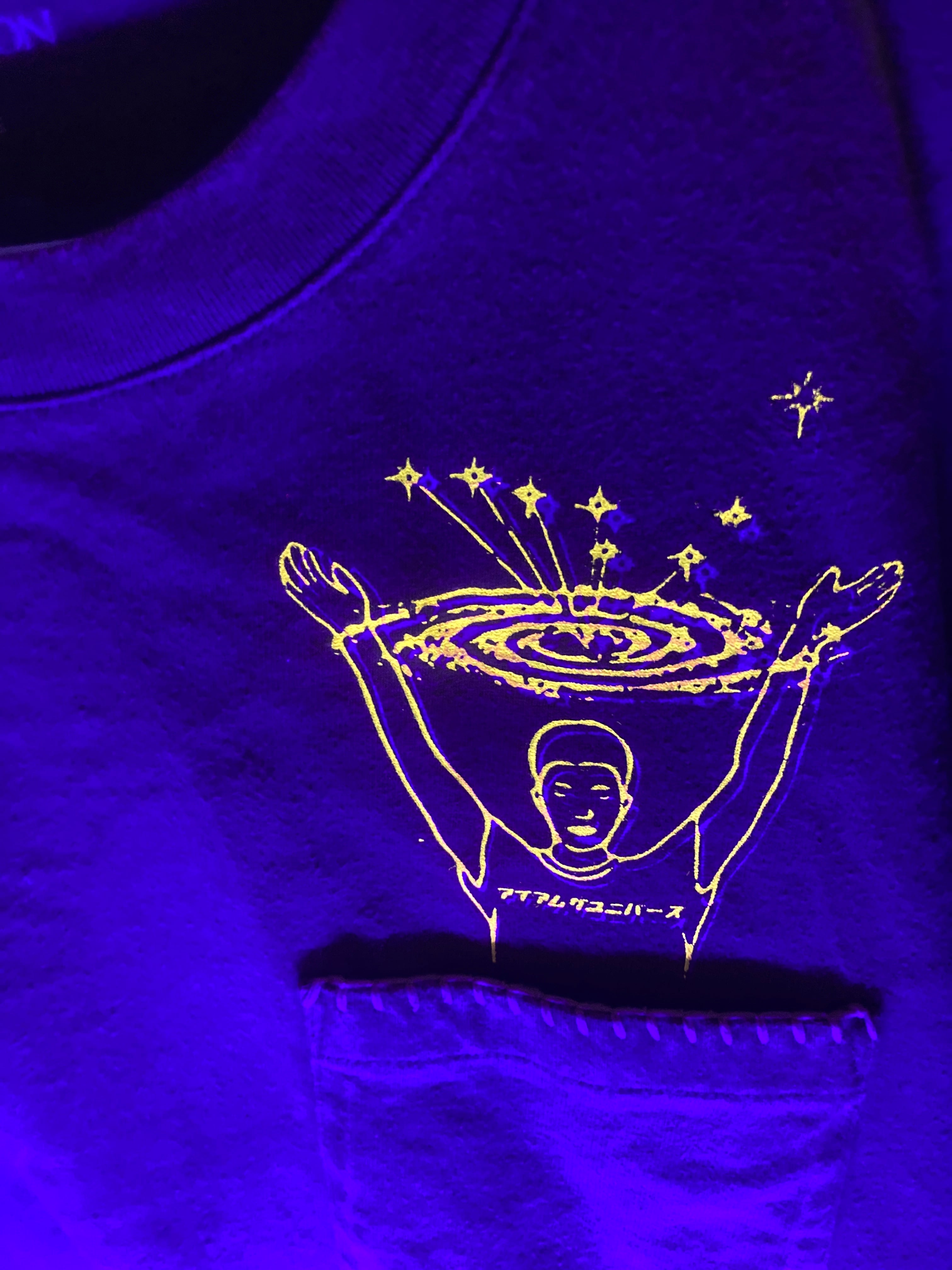 フロントにはアイアムザユニバース男がポケットから出てきて、着てる本人にも他の人にもグッドバイブスをお届けします♪