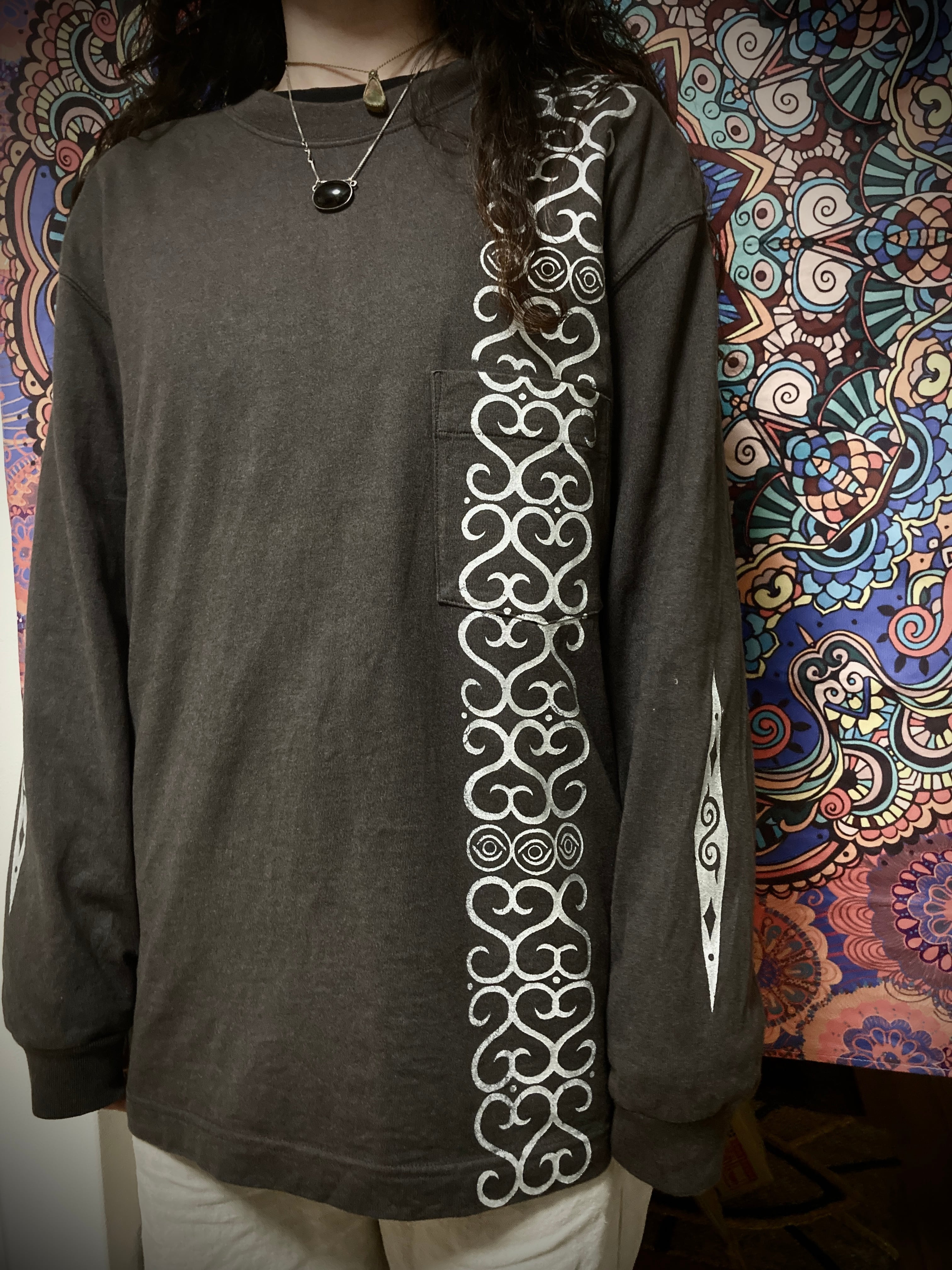 前面には翠雨の美しいトライバルデザインを肩から裾まで、手刷りのシルクならではの場所にプリント。両袖にもワンポイントが綺麗に輝く。